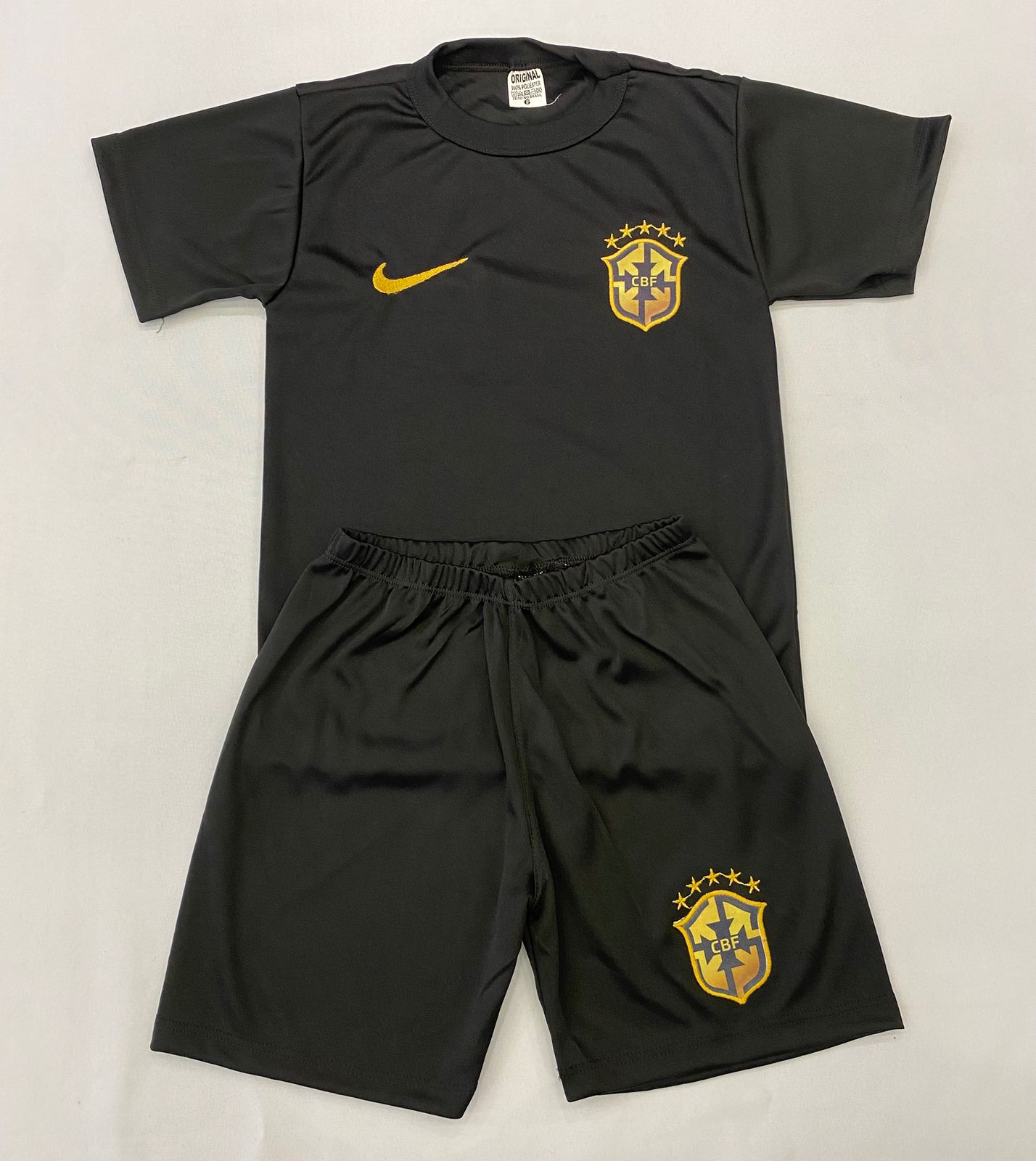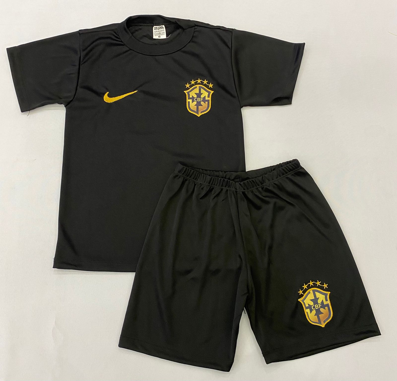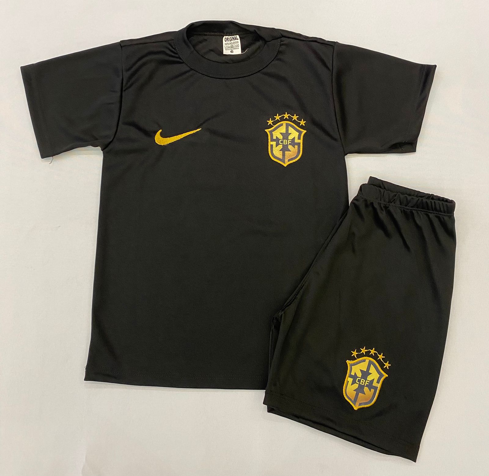O Conjunto Infantil Brasil na versão preta traz um visual moderno e marcante, perfeito para quem gosta de um look esportivo diferenciado. A camiseta preta com detalhes em dourado transmite elegância e personalidade, combinando perfeitamente com a bermuda no mesmo tom.