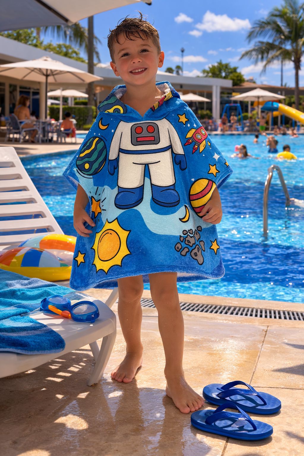 O modelo poncho facilita o vestir, não escorrega do corpo e proporciona liberdade de movimento, além de contar com capuz que auxilia na secagem dos cabelos. Ideal para o dia a dia e momentos de lazer, une funcionalidade e conforto em um só produto.